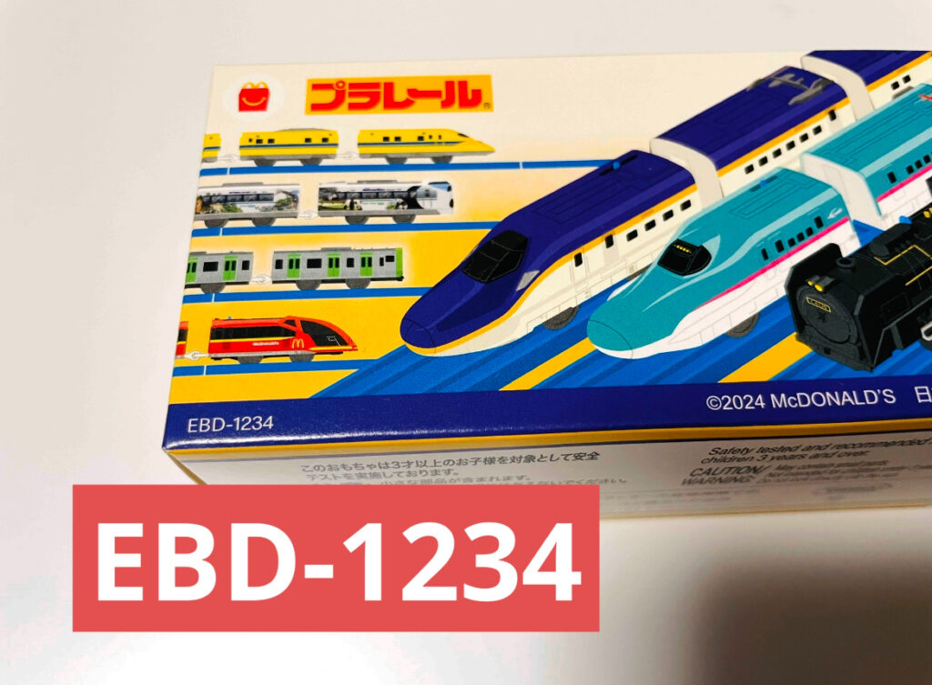 以前ハッピーセットのおもちゃだったプラレールでは、箱の左下に印字されていました。