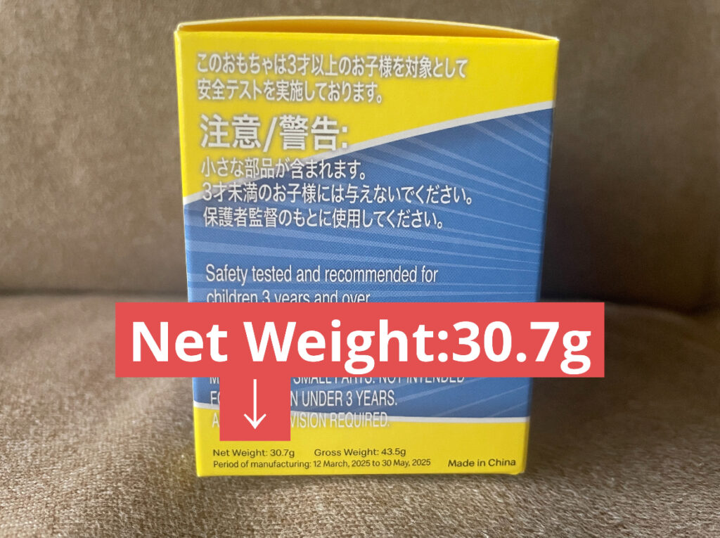 ちなみに、箱の側面には重さの記載があり、グラムでも中身の判別が可能です。